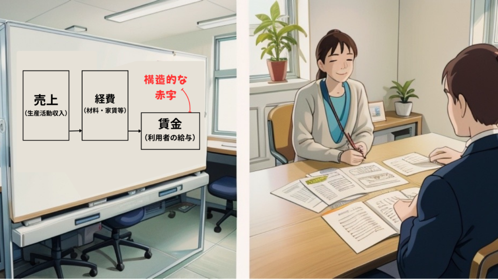- 2024年度の報酬改定で、労働時間と生産活動の成果がスコアに強く反映される仕組みとなり、賃金が低く赤字の事業所ほど報酬減の影響を受けました。