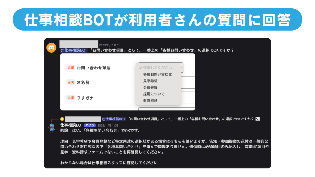それでも難しい場合は、BOTのほうから「わからない場合は仕事相談スタッフに確認してください」と案内します。