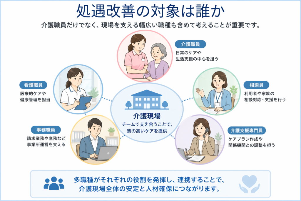 介護現場は、介護職員だけで成り立っているわけではありません。現場全体を支える人材をどう確保するかという観点から見れば、令和8年度改定では、処遇改善の対象をどう設定するかが大きな焦点になりそうです。