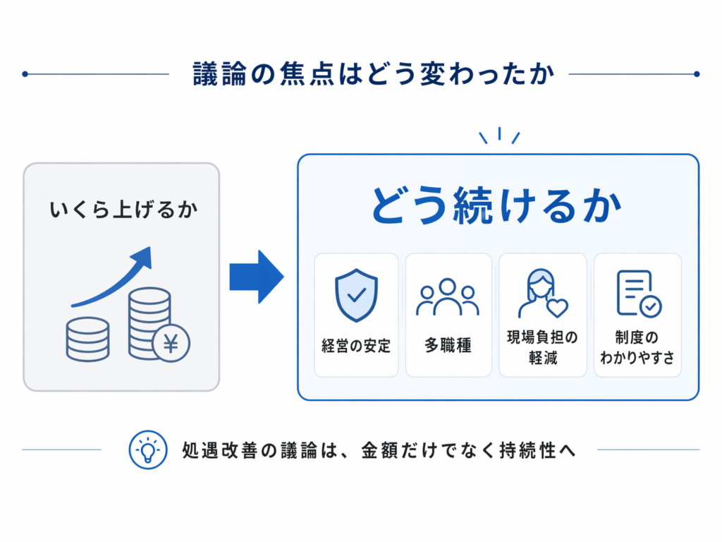 この3つのポイントから見えてくるのは、処遇改善をめぐる議論が、単純に「いくら上げるか」だけではなく、「どうすれば続けられるか」という段階に移っているということです。