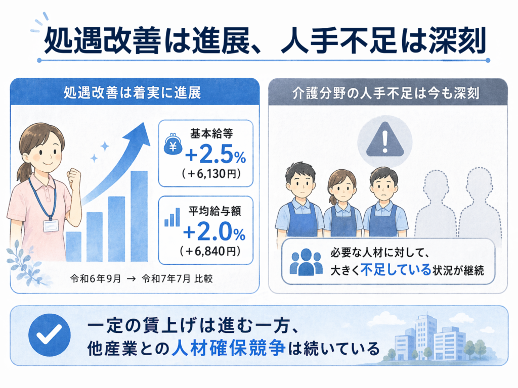 一方で、介護分野の人手不足は今も深刻です。厚労省の資料からは、処遇改善の議論を先送りできない状況にあることがうかがえます。実態調査では、処遇改善加算を取得している施設・事業所の介護職員について、令和6年9月と令和7年7月を比較すると、基本給等が2.5%、金額にして6,130円、平均給与額が2.0%、金額にして6,840円増加したとされています。