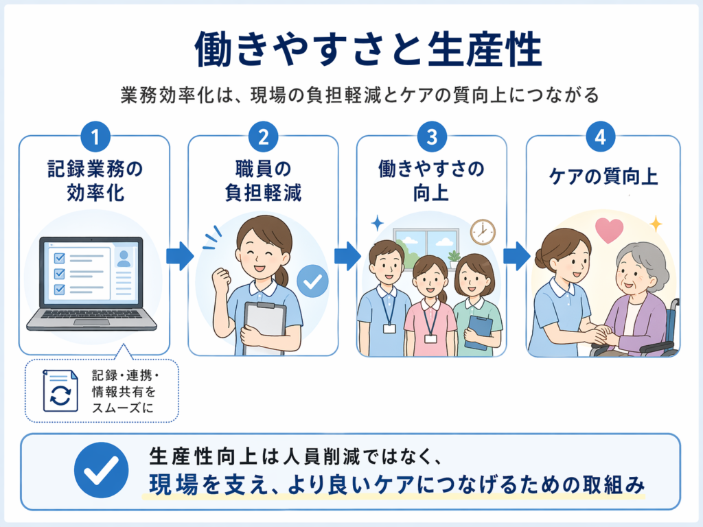 ここで重要なのは、厚労省の資料が、生産性向上を単なる効率化や人員削減の話として扱っていないことです。分科会での主な意見でも、生産性向上や業務効率化は、現場の負担を減らし、職員が働き続けやすい環境を整え、その結果としてケアの質の向上にもつなげていくものだとされています。